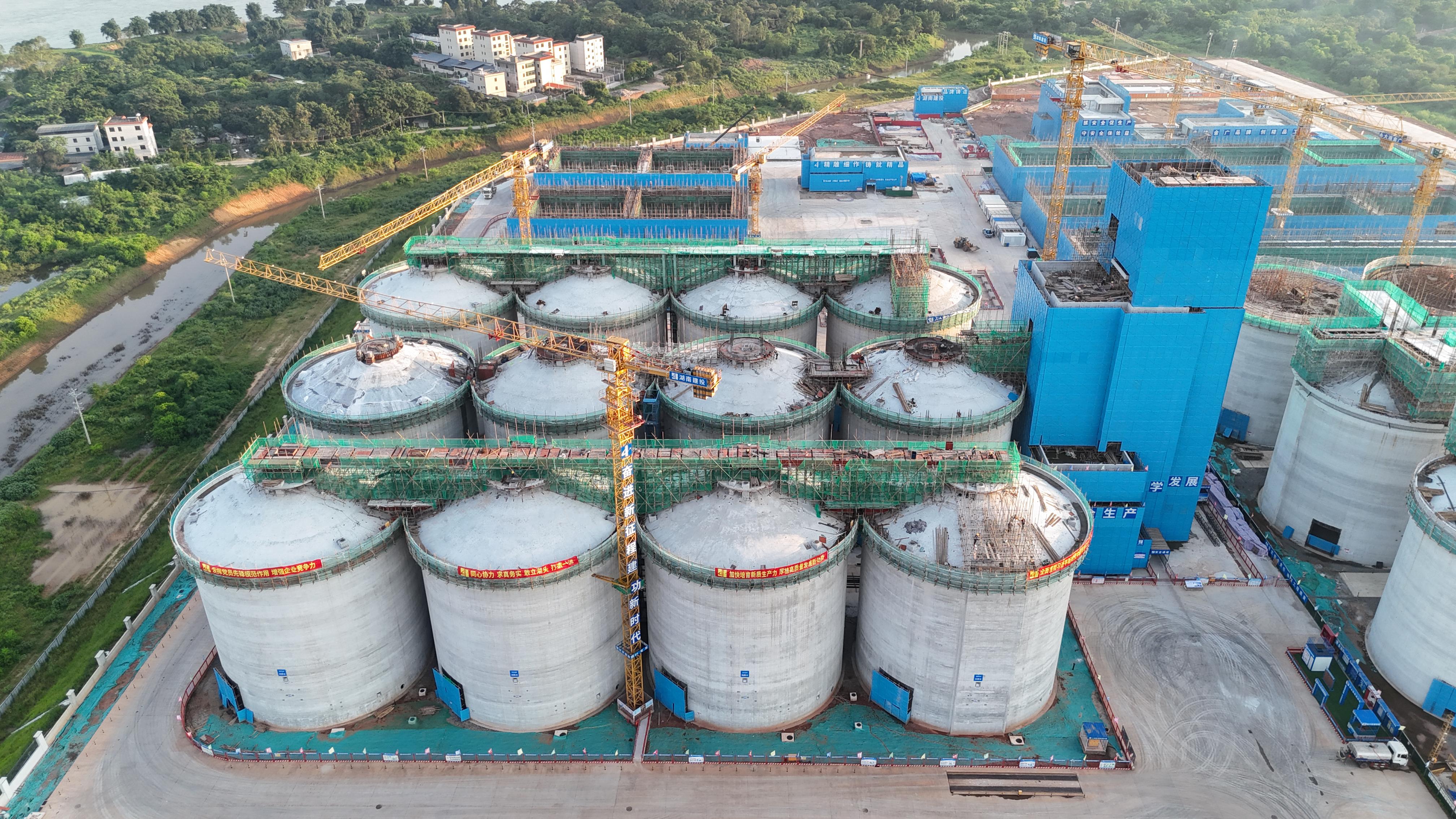 面對工期緊、任務重、技術要求高等挑戰,項目團隊攻堅克難,251天完成12座淺圓倉與提升塔主體結構封頂,預計2025年12月31日竣工。
